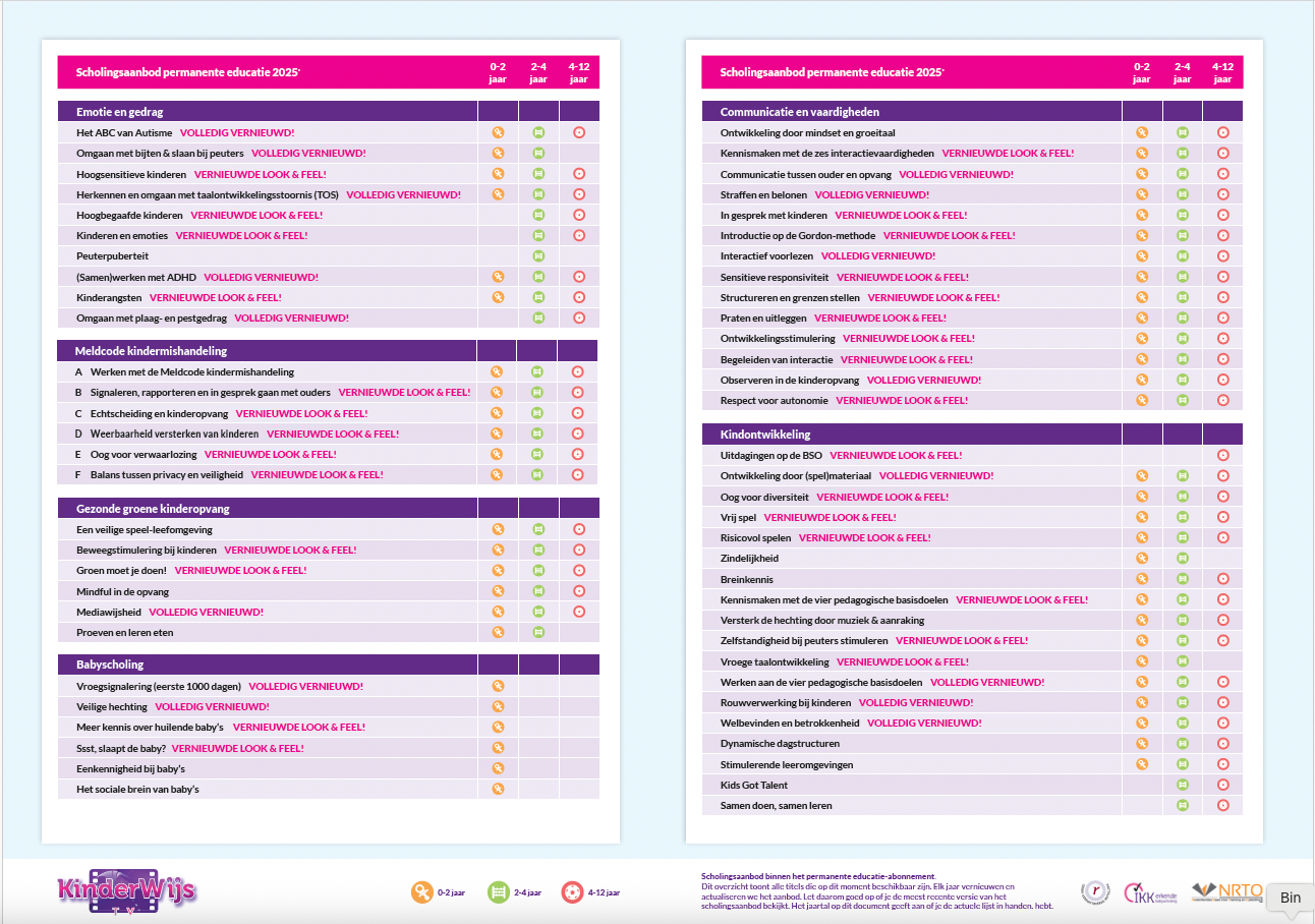 Ontdek de eenvoud en effectiviteit van online scholing voor jouw kinderopvangorganisatie, ongeacht de omvang, met KinderWijs TV. Met 90+ pedagogische cursussen geef je je team de mogelijkheid om zelf hun nascholing te regelen, op een tijdstip en locatie naar keuze.
